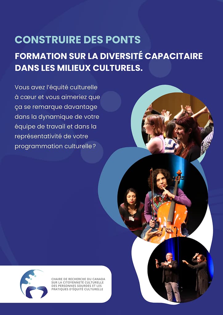 - Créer et co-construire des pratiques d’équité culturelle, notamment en matière d’accessibilité et d’autodétermination culturelles des personnes sourdes.